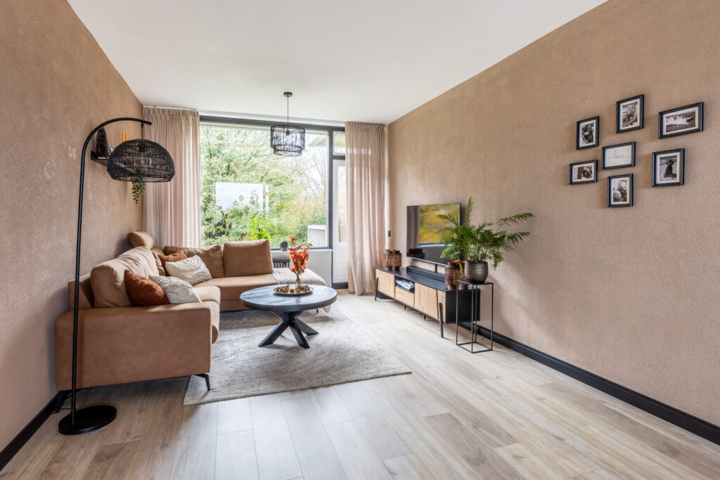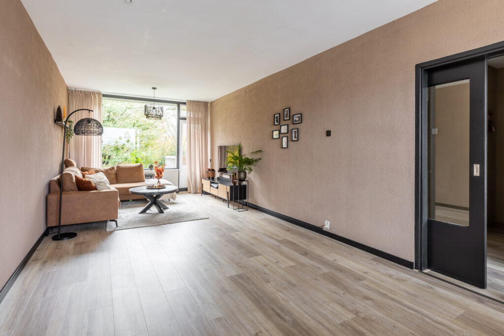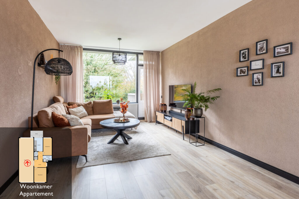 Laat je verrassen door de riante woonkamer met kamerbrede raampartijen en toegang tot het balkon. Het kozijn is voorzien van een elektrisch bedienbaar zonnescreen.