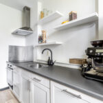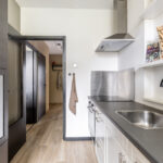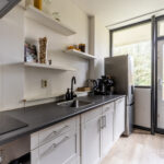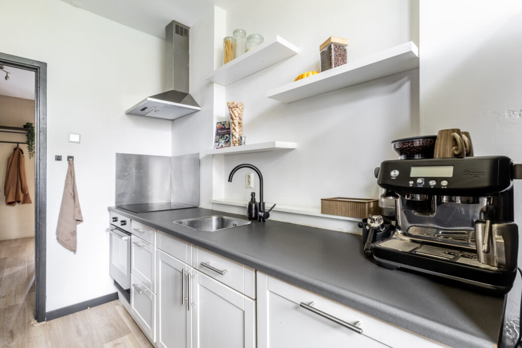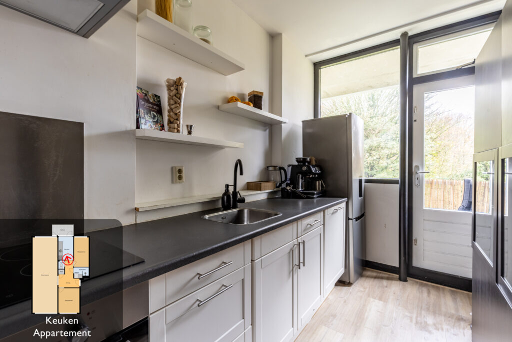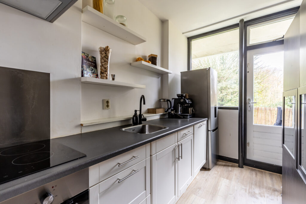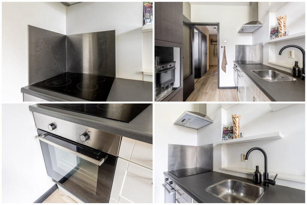 De halfopen keuken is voorzien van een recht keukenblok met diverse inbouwapparatuur, zoals een inductiekookplaat, afzuigkap, enkele spoelbak, vaatwasser, oven en vrijstaande koel-/vriescombi. Ook vanuit hier is het balkon toegankelijk.