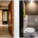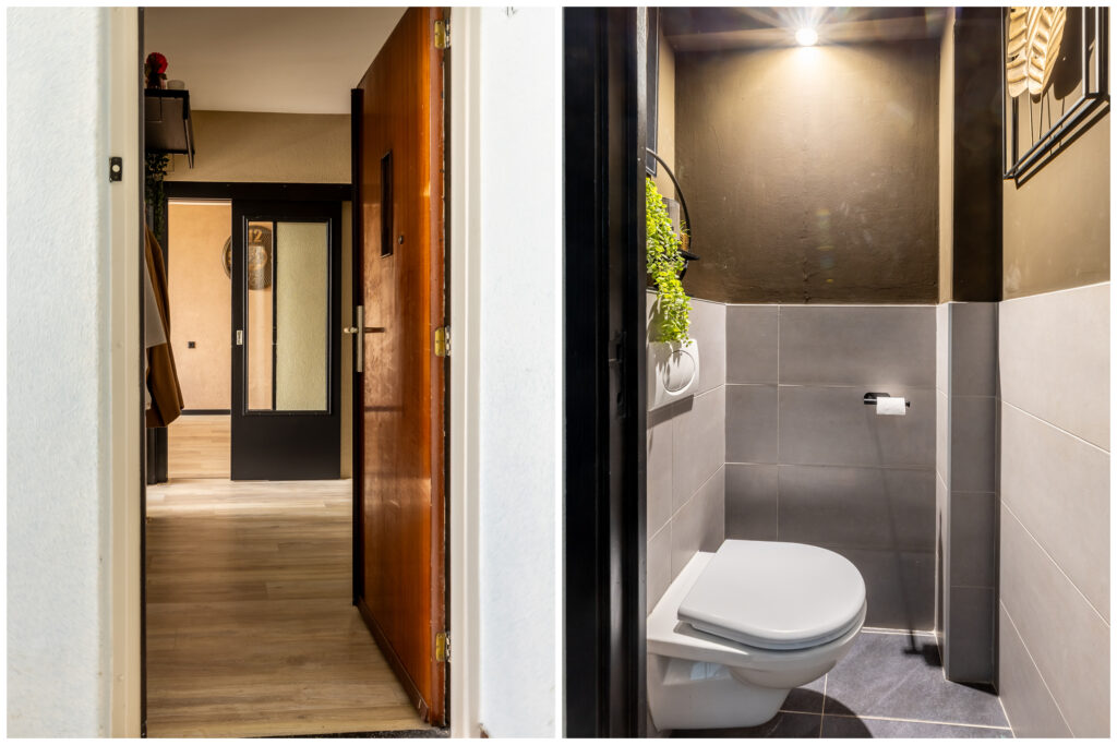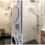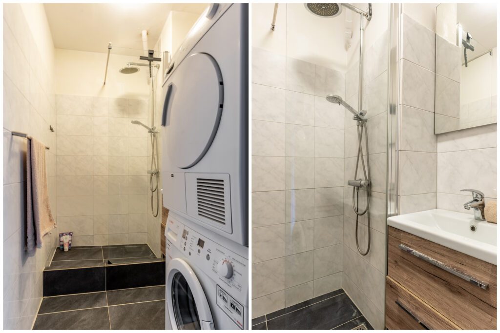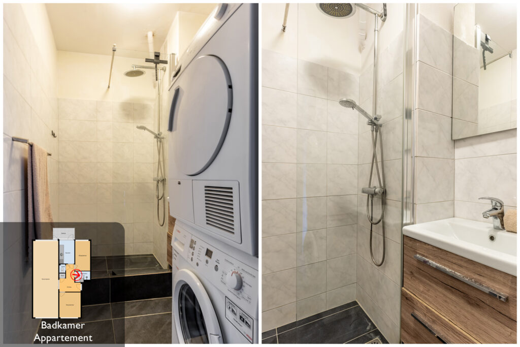 De badkamer is voorzien van een douche, wastafel en opstelplek voor zowel wasmachine als -droger. Het separate toilet is voorzien van een wandcloset.