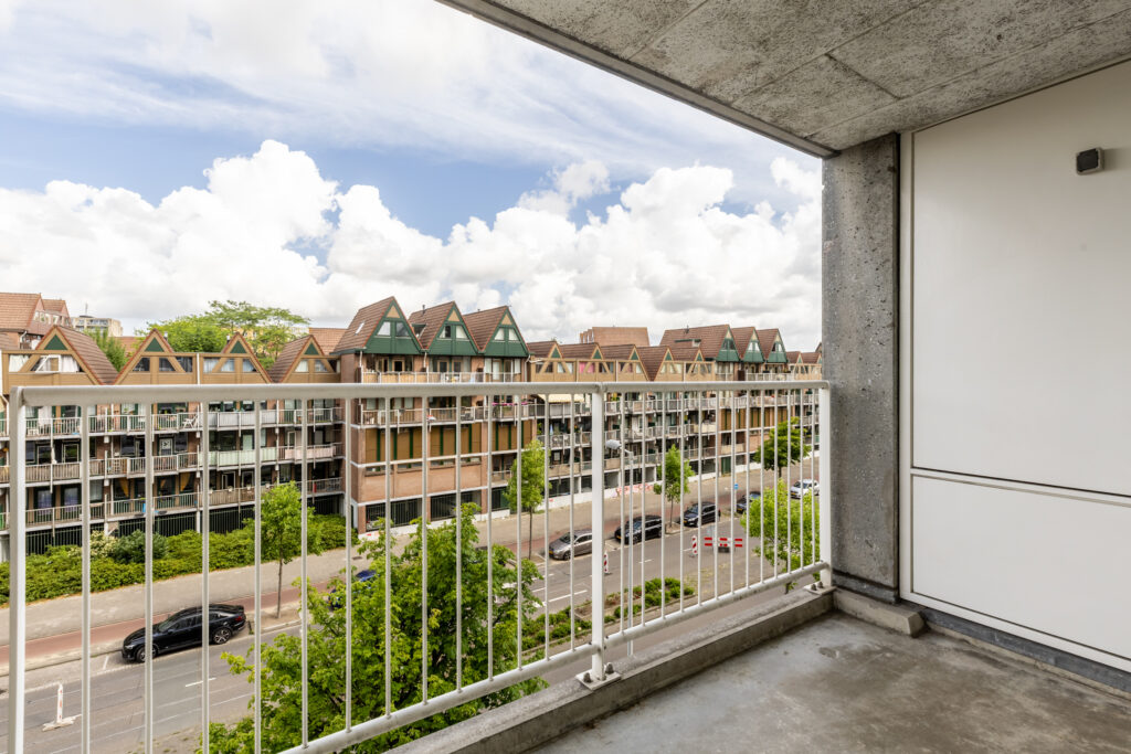 Het ruime inpandige balkon is toegankelijk vanuit de slaapkamer en biedt een fraai uitzicht over het centrum.
