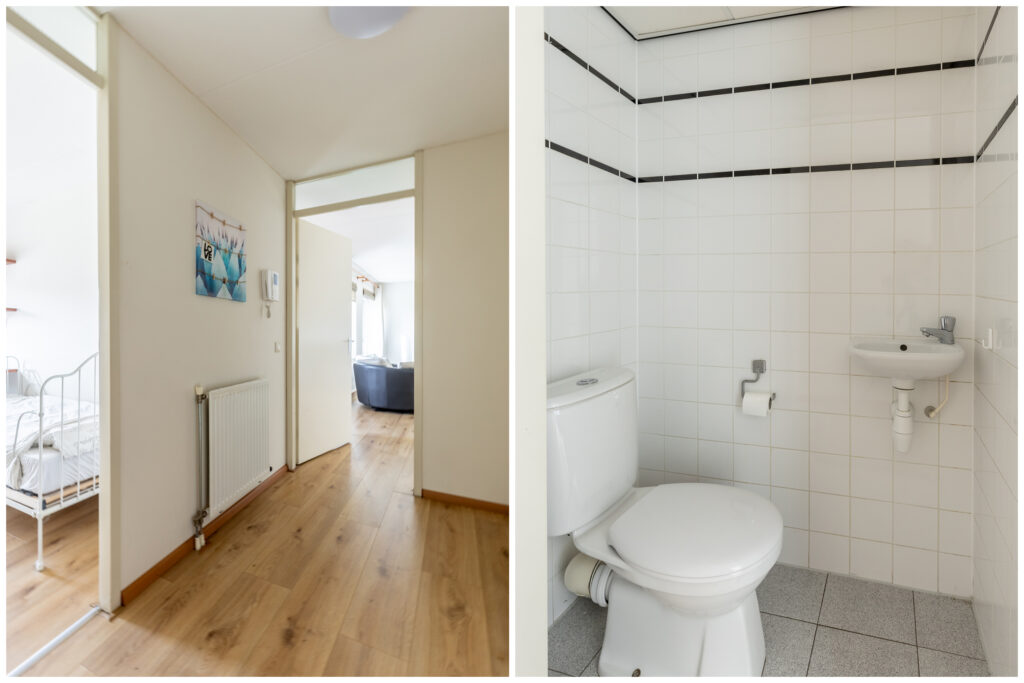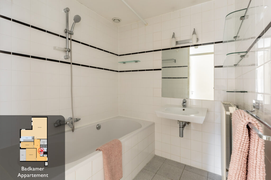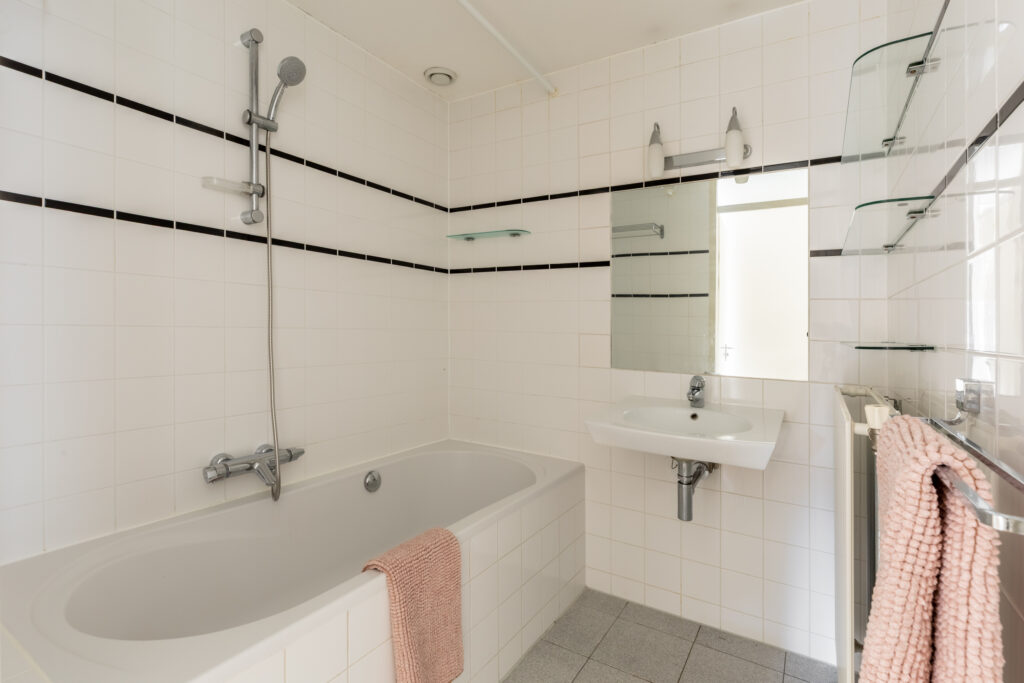 De badkamer is voorzien van een ligbad en wastafel; in de hal bevindt zich een separaat toilet. Verder is er nog een berging met opstelplek voor de wasmachine en cv-ketel.