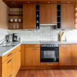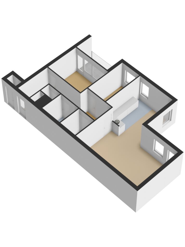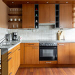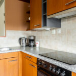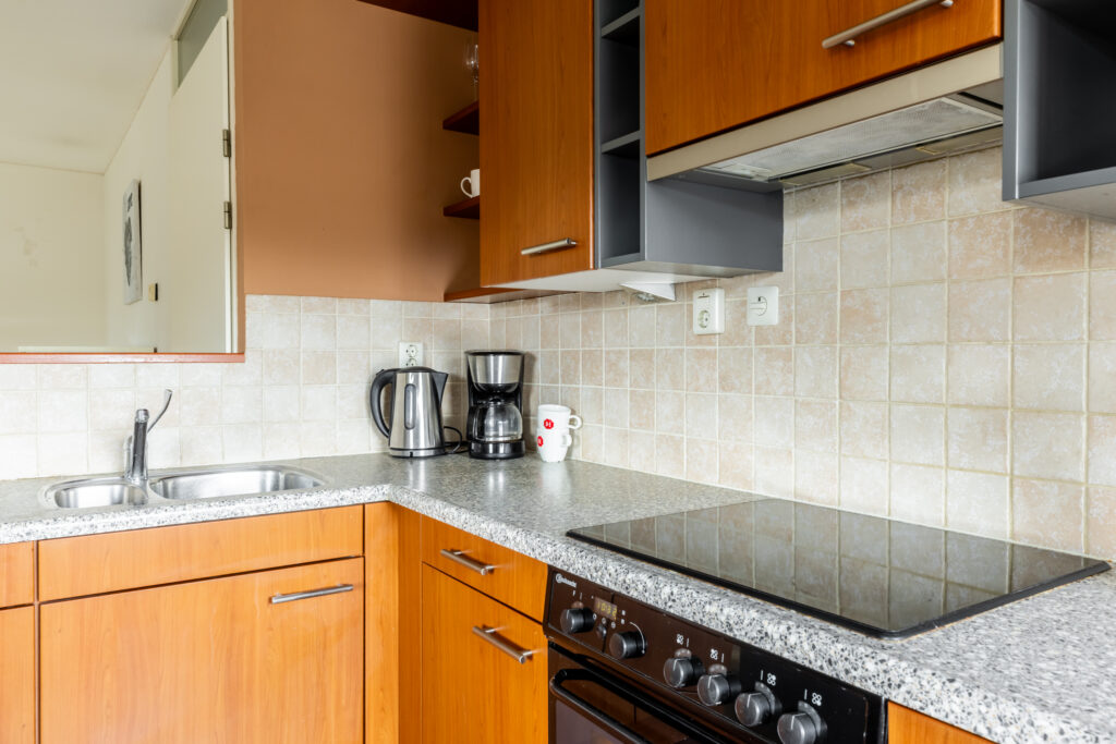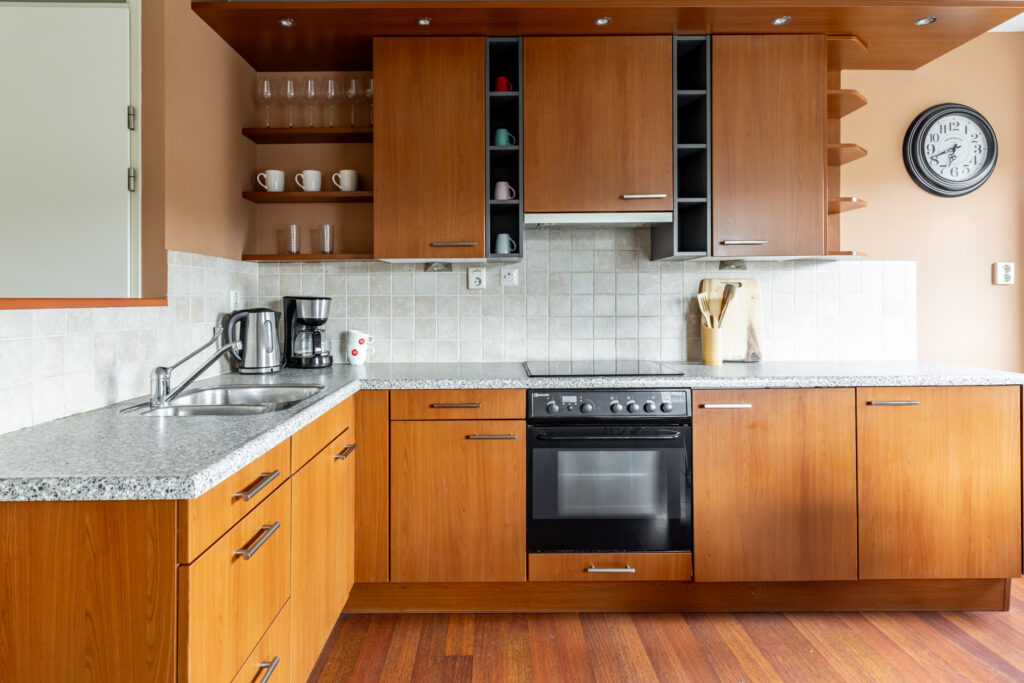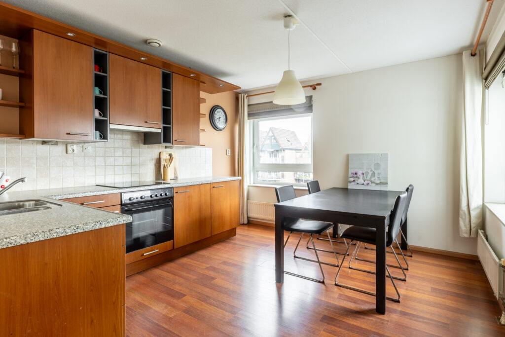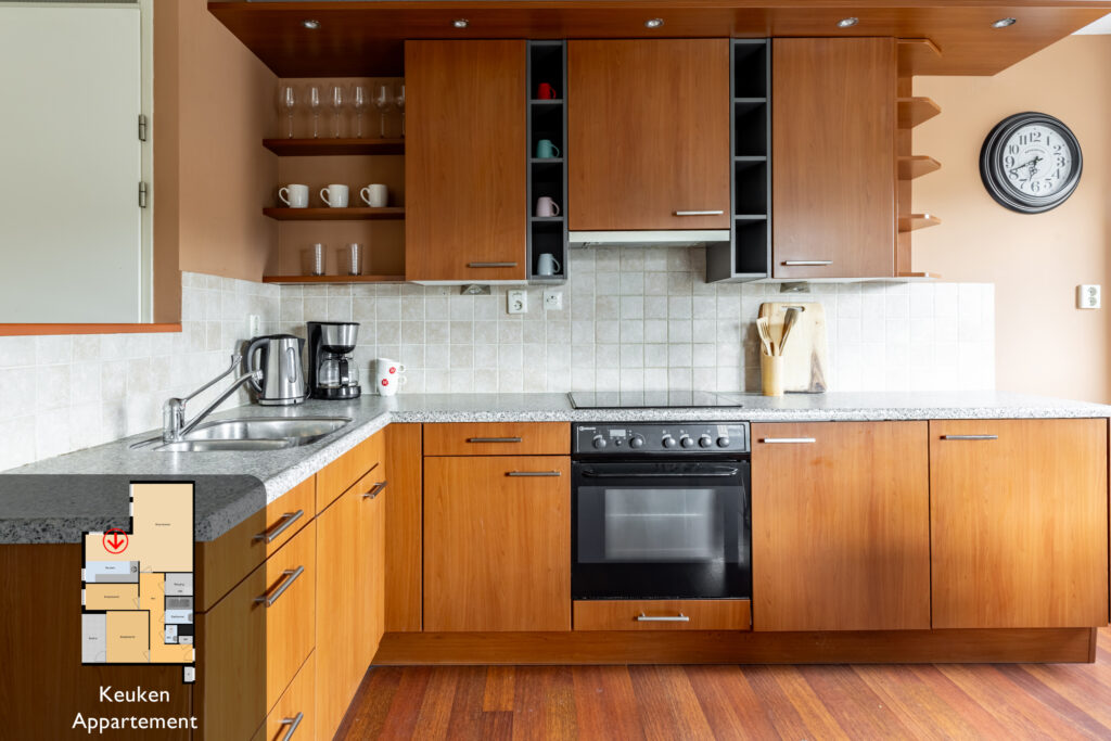 De open keuken is in hoekopstelling en voorzien van inbouwapparatuur zoals een spoelbak, inductiekookplaat, afzuigkap, oven en koelkast.