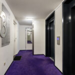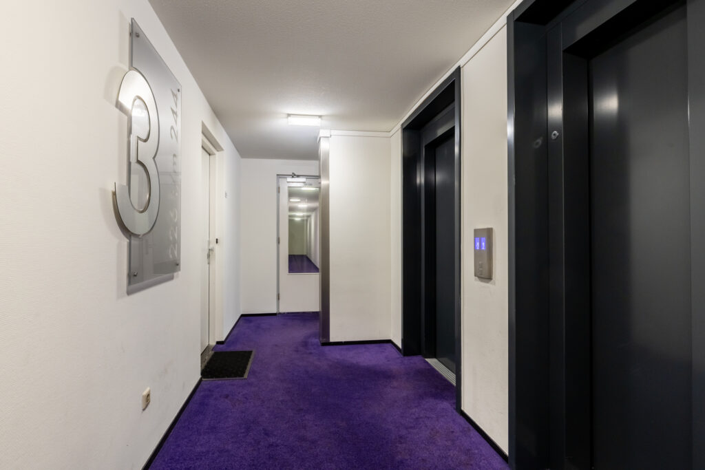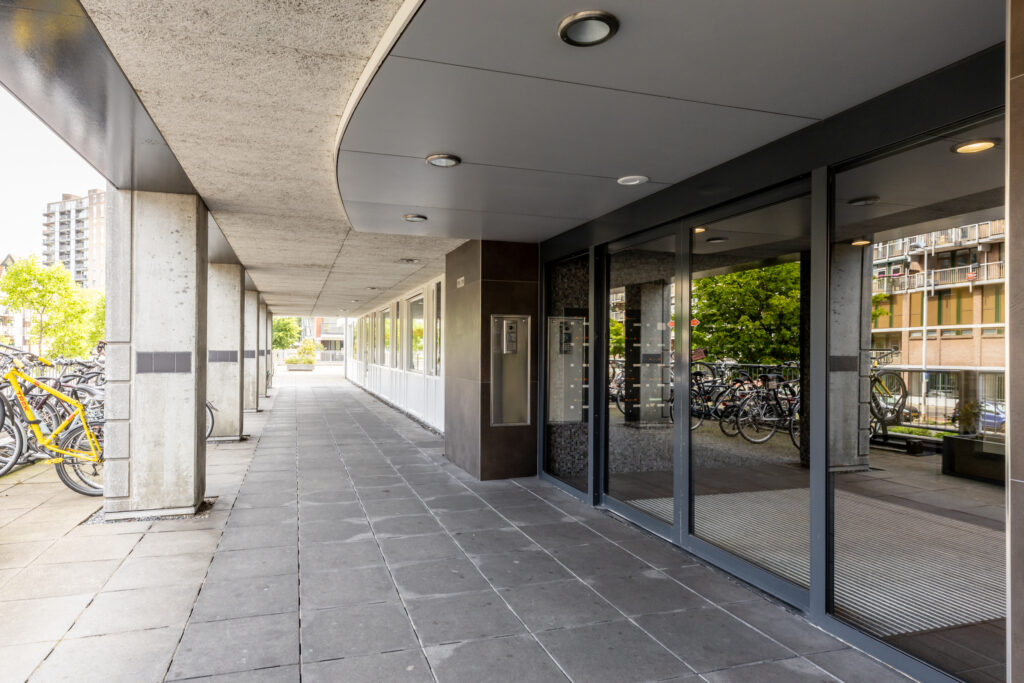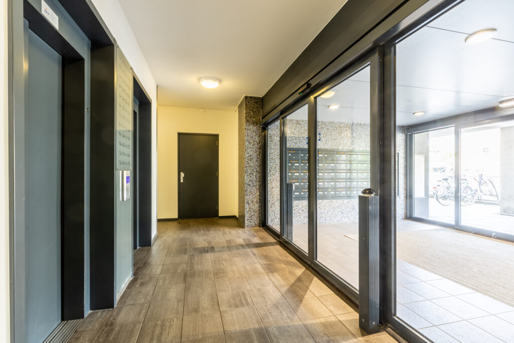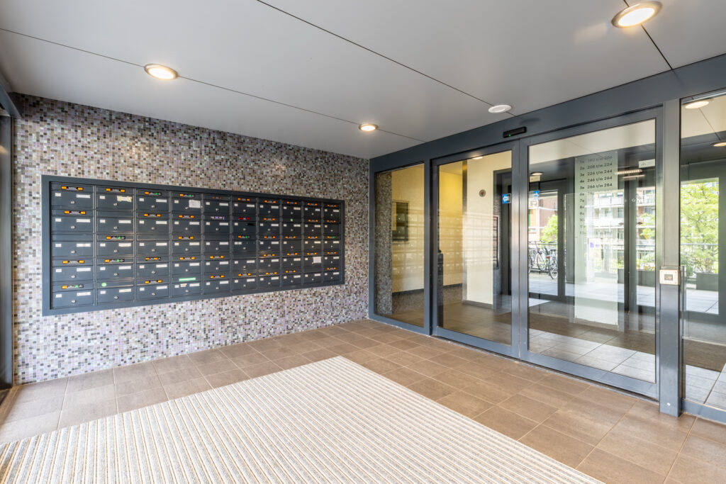 Afsluitbare entree met bellentableau, videofoon, brievenbussen en liften waarmee zowel de woonlagen als de parkeergarage en berging bereikbaar zijn.