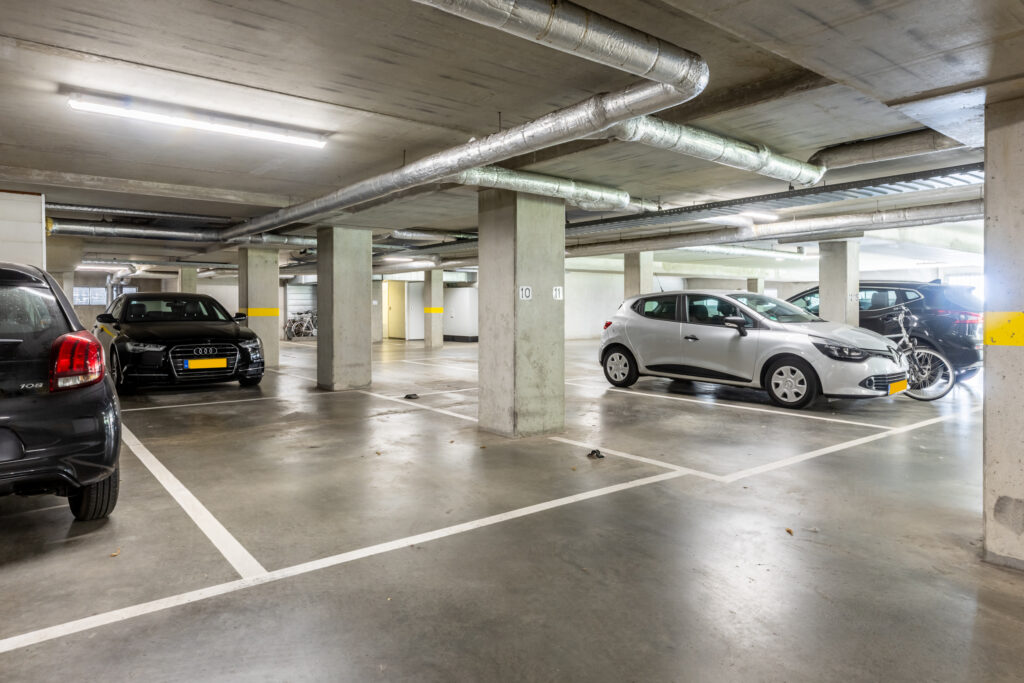 Het complex beschikt over een eigen parkeerkelder, verdeeld over 2 lagen. De parkeerplaats, welke bij dit appartement apart verkrijgbaar is, bevindt zich op -1.