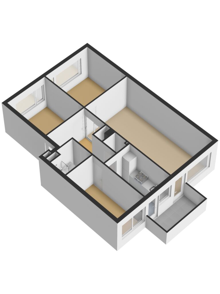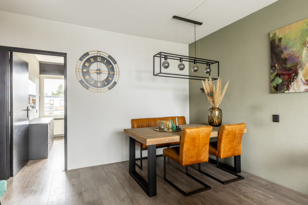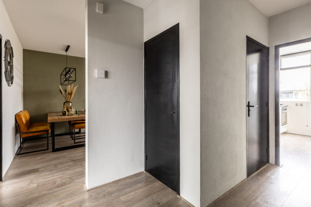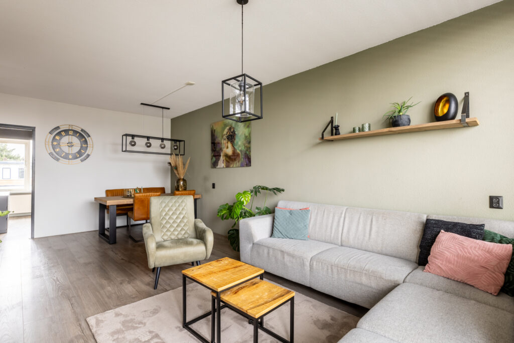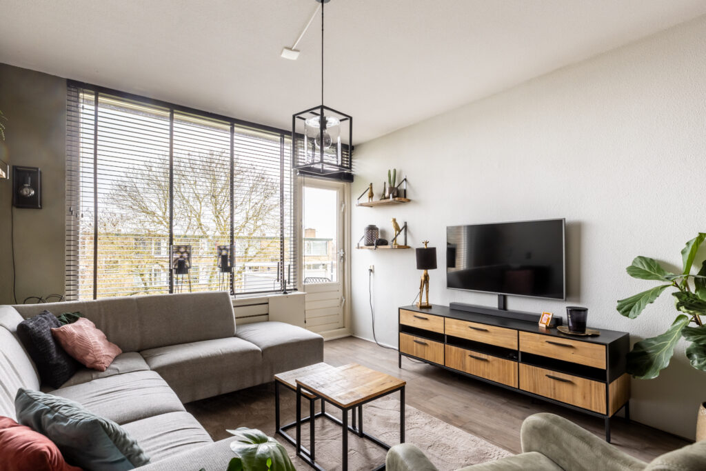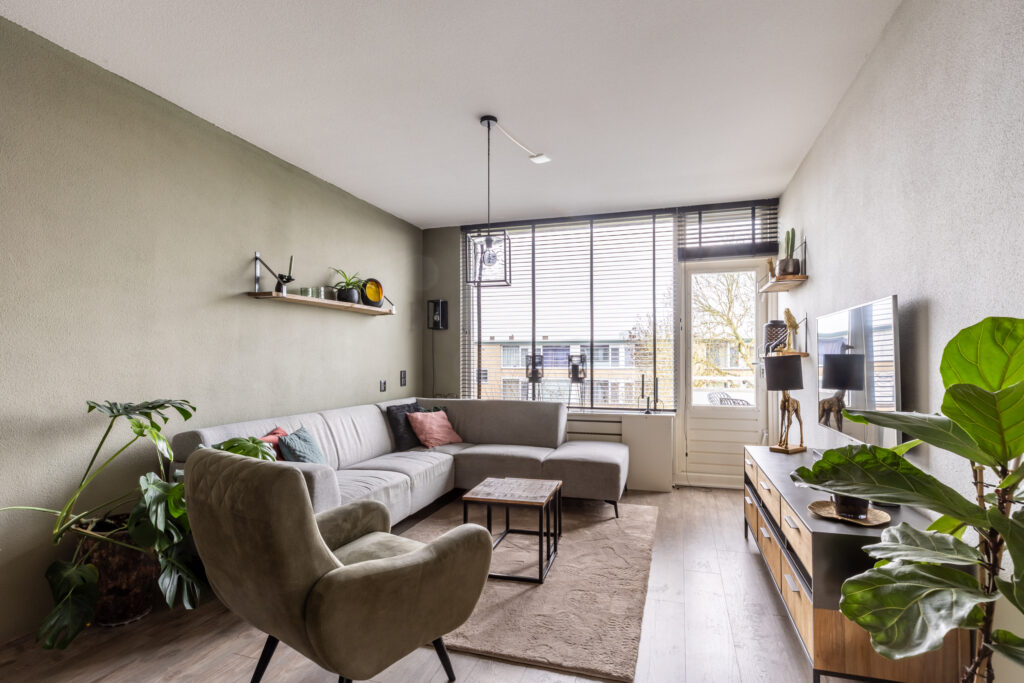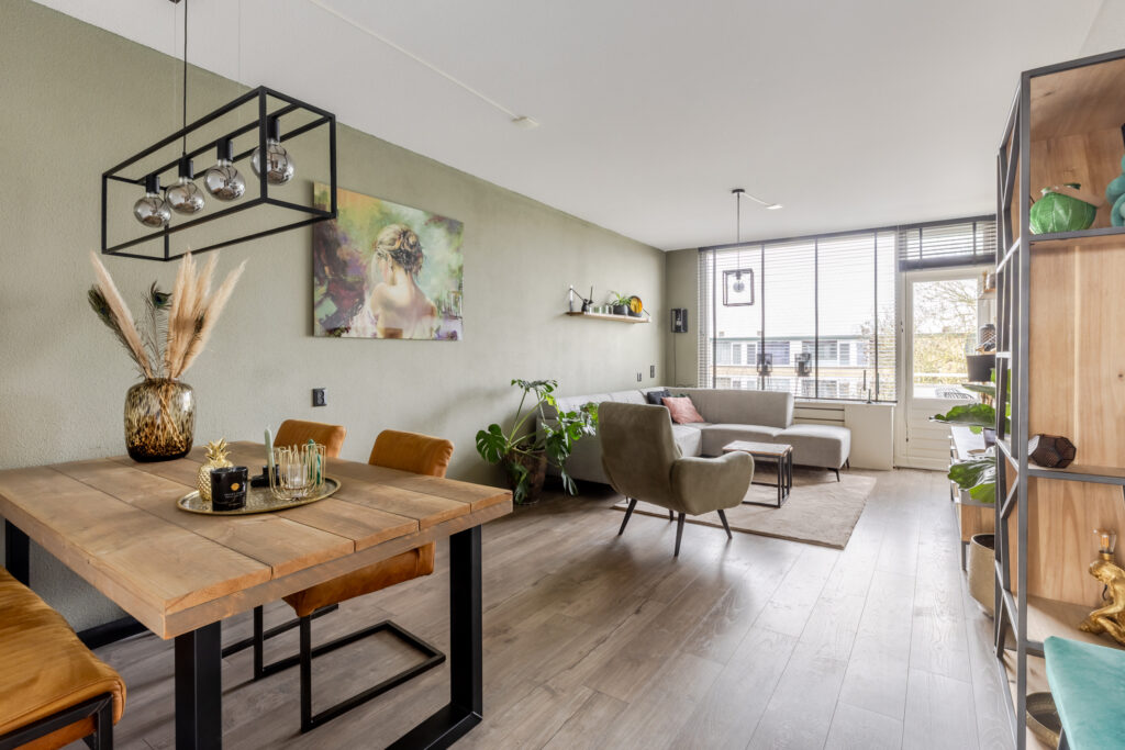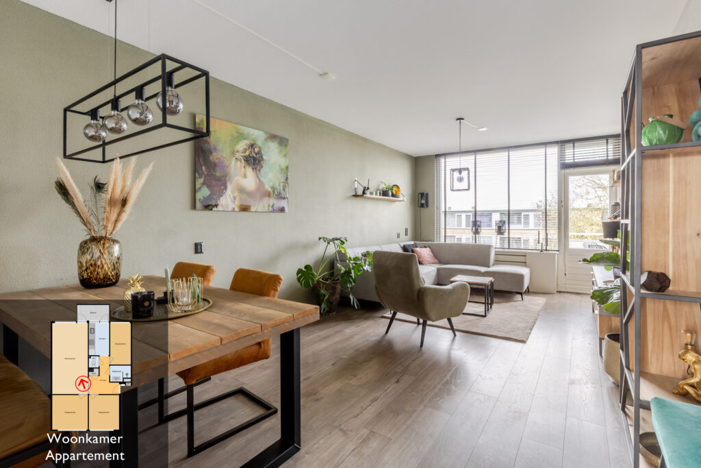 De woonkamer, met toegang tot het balkon, heeft een fijne lichtinval door de kamerbrede raampartij en staat in open verbinding met de hal, wat een heerlijk ruimtelijk gevoel geeft.