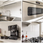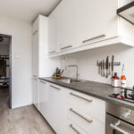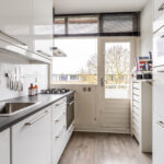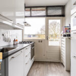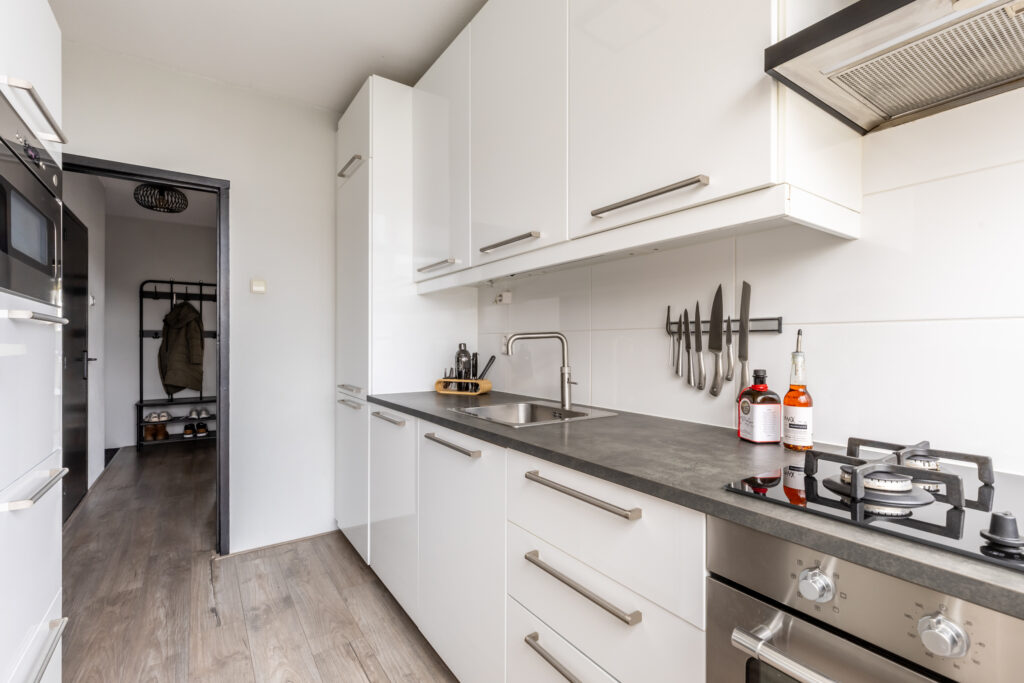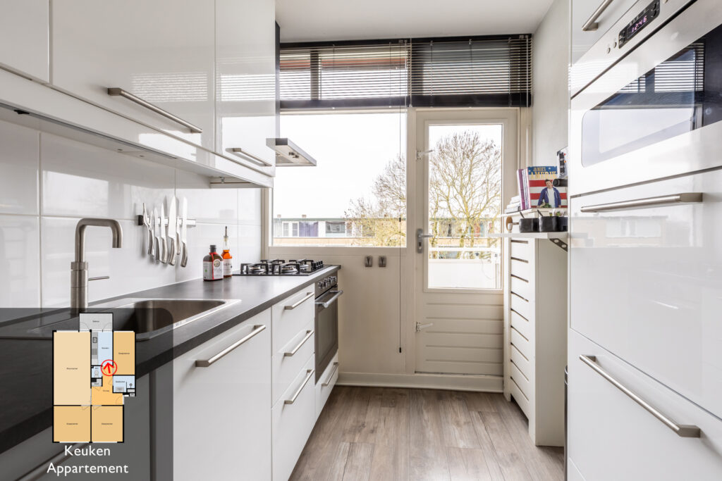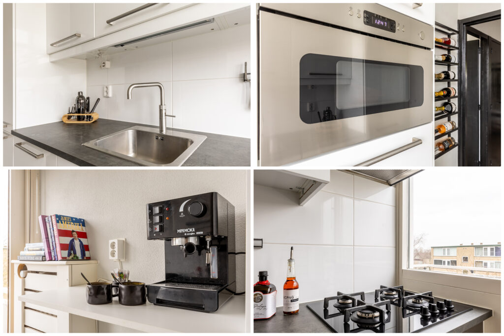 De halfopen moderne keuken is ingericht met een recht keukenblok en tegenoverliggende kastenwand en is voorzien van inbouwapparatuur, zoals een enkele spoelbak met Quooker kraan, 4-pits gaskookplaat, afzuigkap, vaatwasser, koelkast, vriezer, magnetron en oven. Ook vanuit de keuken is er toegang tot het balkon.