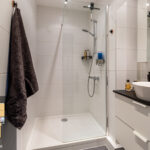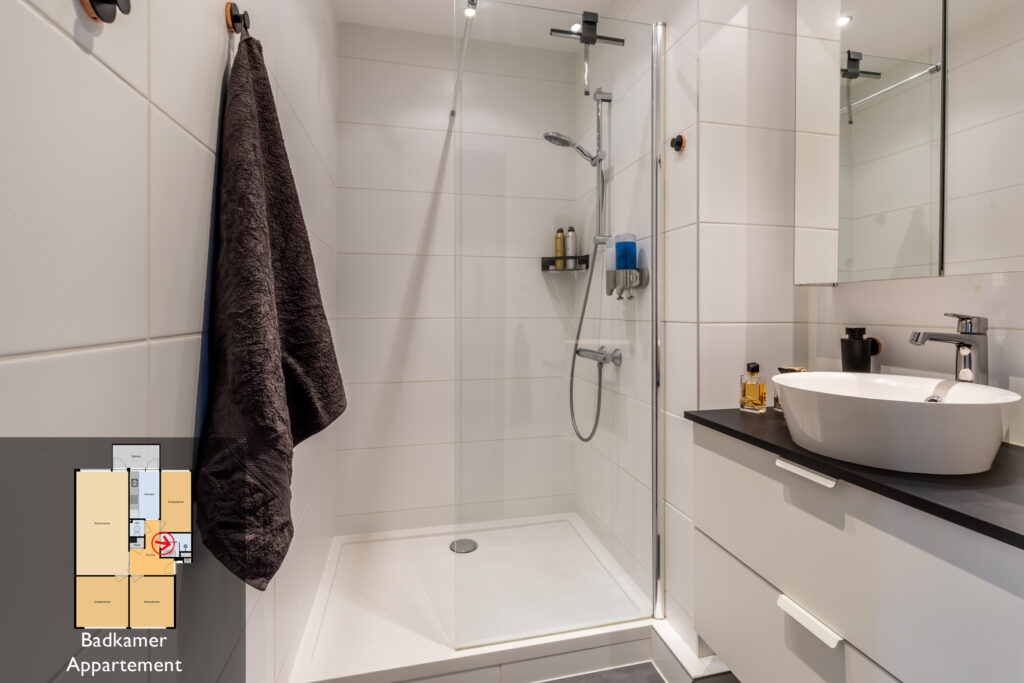 De moderne badkamer is ingericht met een douche en meubel met wastafel.