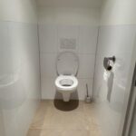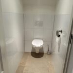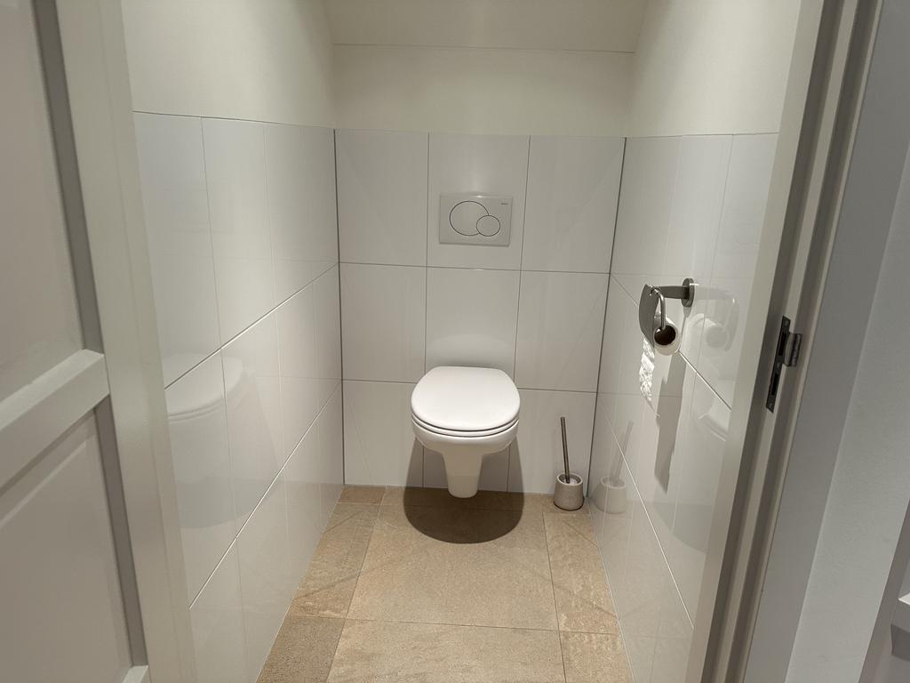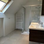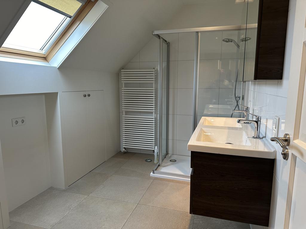 Ruime overloop met vlizotrap naar bergzolder, berging, separaat toilet met wandcloset en fonteintje, badkamer met wastafelmeubel met dubbele wastafel, inloopdouche, handdoekradiator en dakraam.
