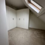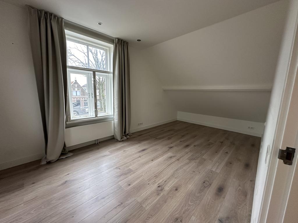 Ruime slaapkamer aan de voorzijde voorzien van laminaat en gordijnen. 2e slaapkamer met U-vromige kastenwand.
