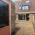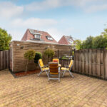De tuin is gelegen op het noordoosten en ingericht met sierbestrating en vaste plantenborders. Er is een afsluitbaar achterom, een buitenkraan en een houten berging voorzien van elektra.