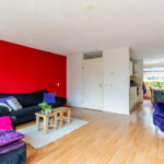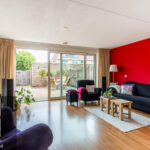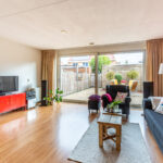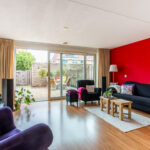 De woonkamer is tuingericht en heeft een optimale lichtinval door de kamerbrede raampartij met schuifpui aan de achterzijde.