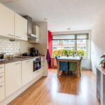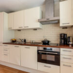 De open keuken bestaat uit een recht keukenblok met diverse inbouwapparatuur zoals een inductiekookplaat, afzuigkap, enkele spoelbak, vaatwasser, koelkast, vriezer en combi-oven.