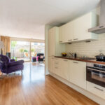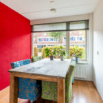Door de ligging van de keuken is er aan de voorzijde van de woning een sfeervolle eethoek gecreëerd met uitzicht op de voortuin.