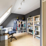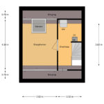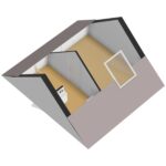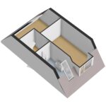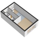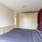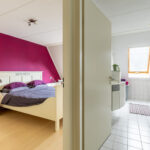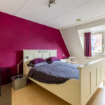 De slaapkamer is gelegen over de gehele lengte van de woning, heeft een hoge nok en voelt daardoor nog ruimer aan. Aan de achterzijde is er een groot dakraam en er is bergruimte achter het knieschot.