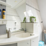 De badkamer is voorzien van een douche, ligbad, wastafel en er is een opstelplek voor de wasmachine.