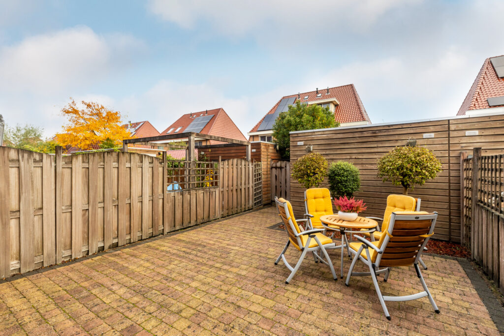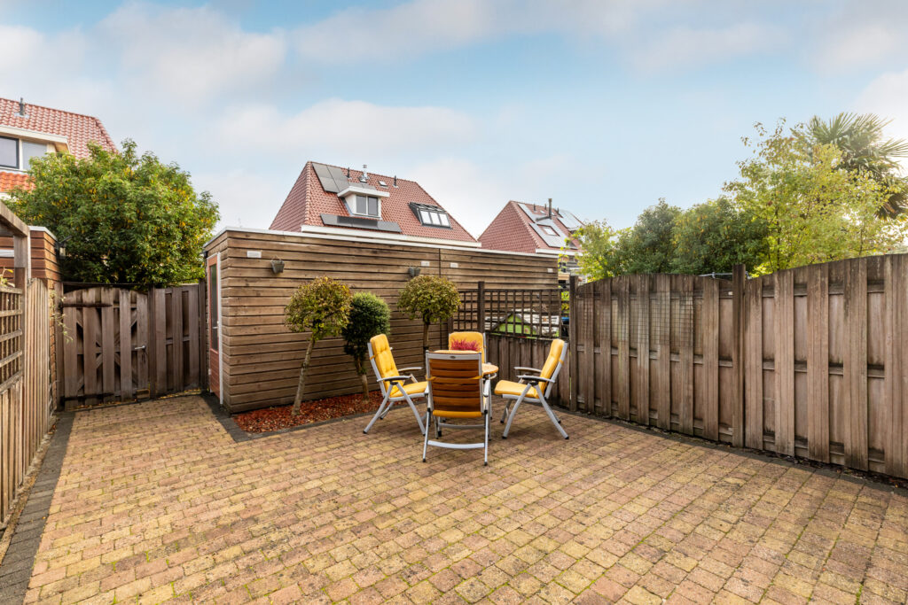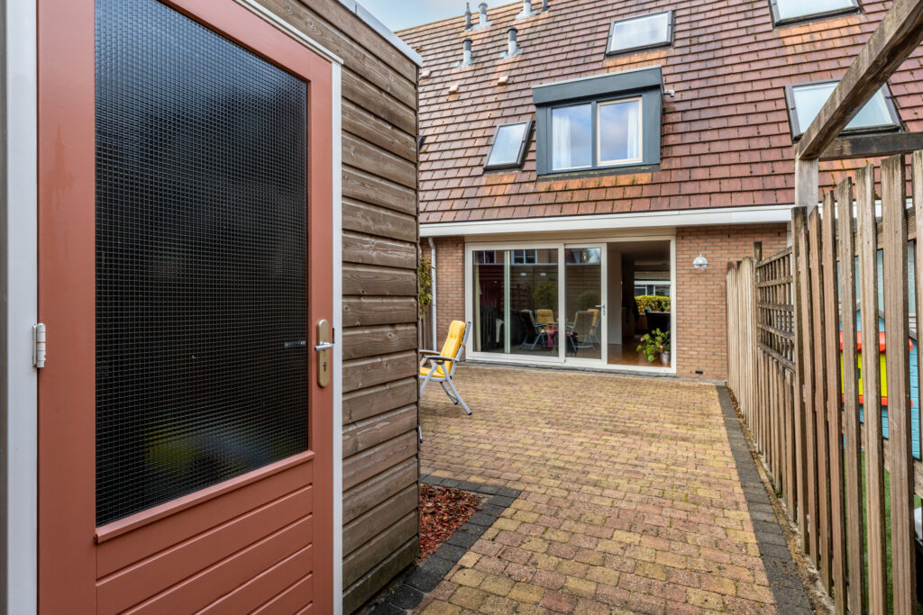 De tuin is gelegen op het noordoosten en ingericht met sierbestrating en vaste plantenborders. Er is een afsluitbaar achterom, een buitenkraan en een houten berging voorzien van elektra.