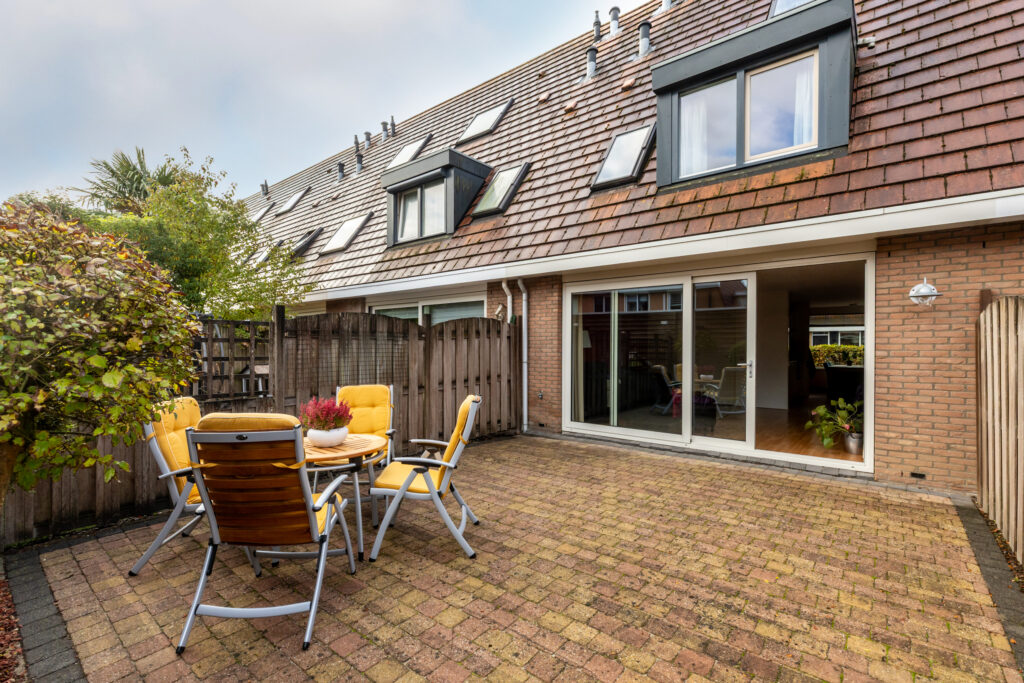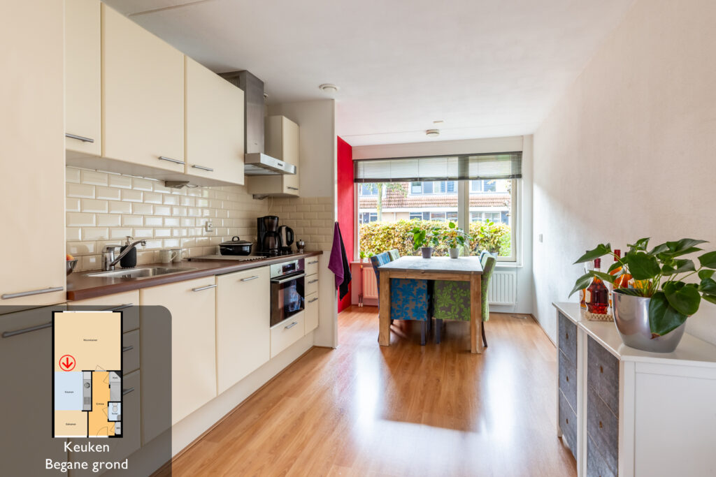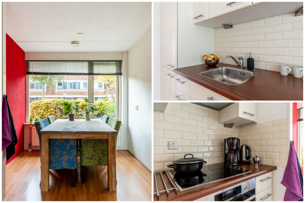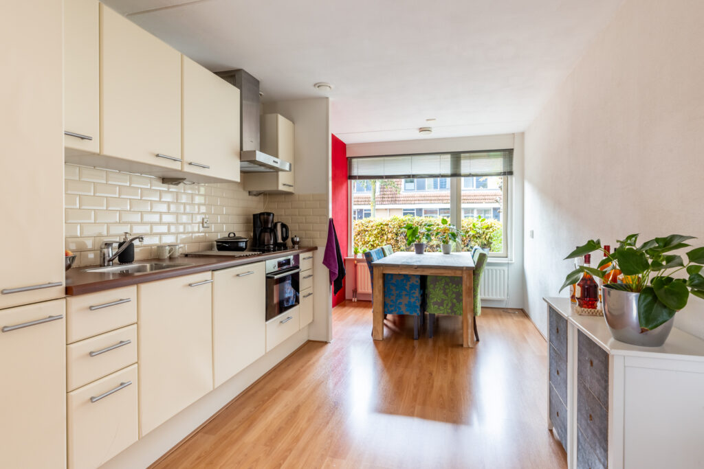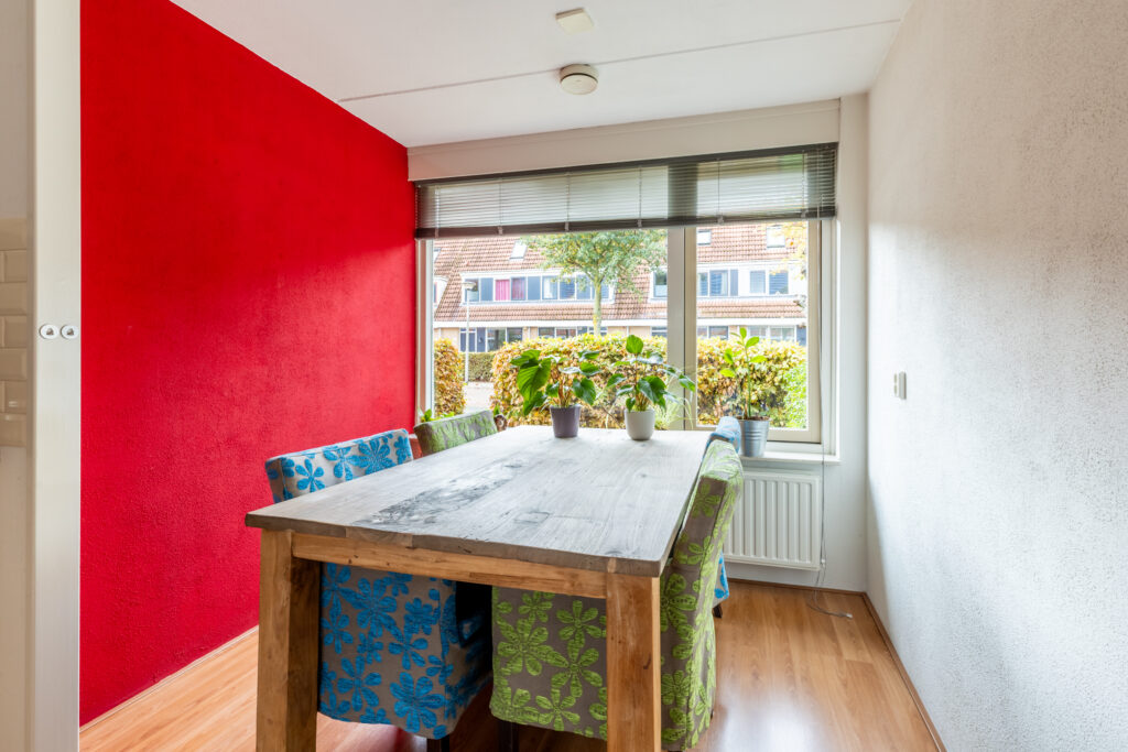 Door de ligging van de keuken is er aan de voorzijde van de woning een sfeervolle eethoek gecreëerd met uitzicht op de voortuin.