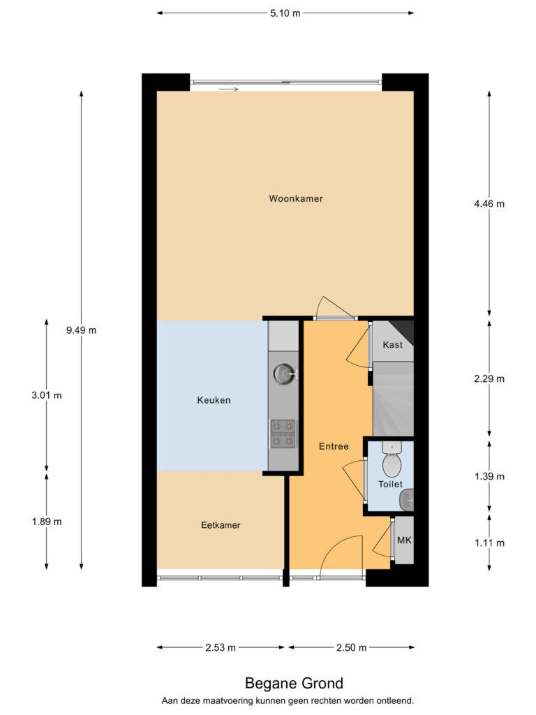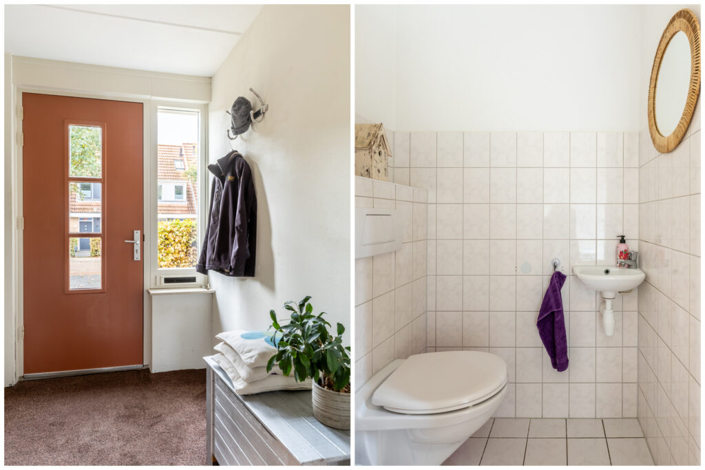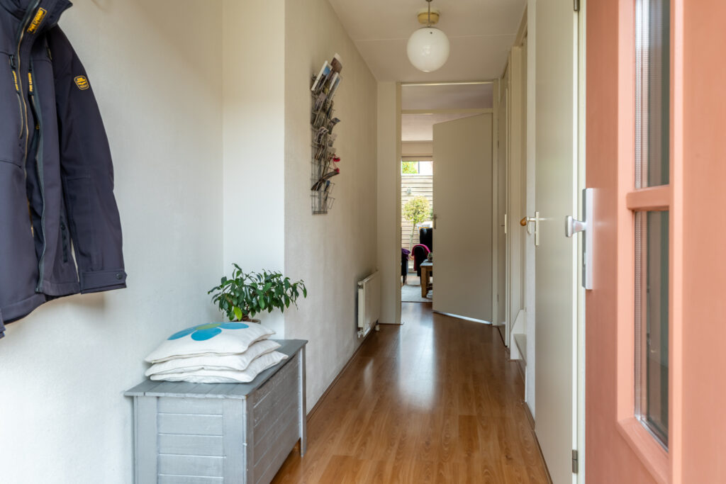 Je betreedt de woning via de riante hal met garderobe, meterkast, toiletruimte, trapopgang naar de verdieping, trapkast en toegang tot de woonkamer.