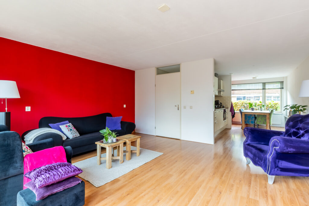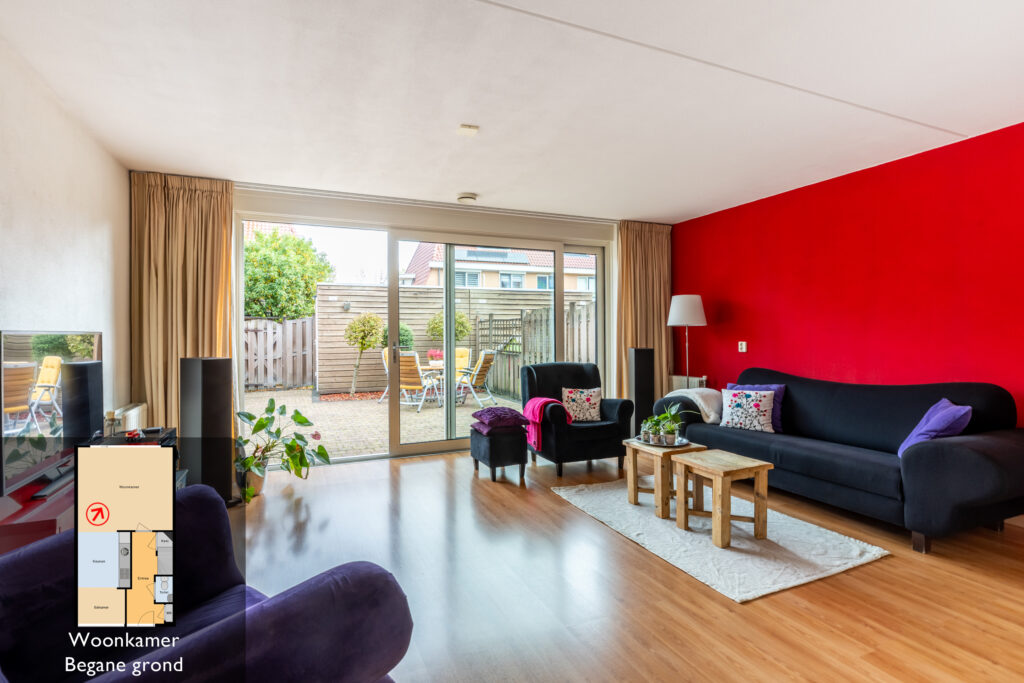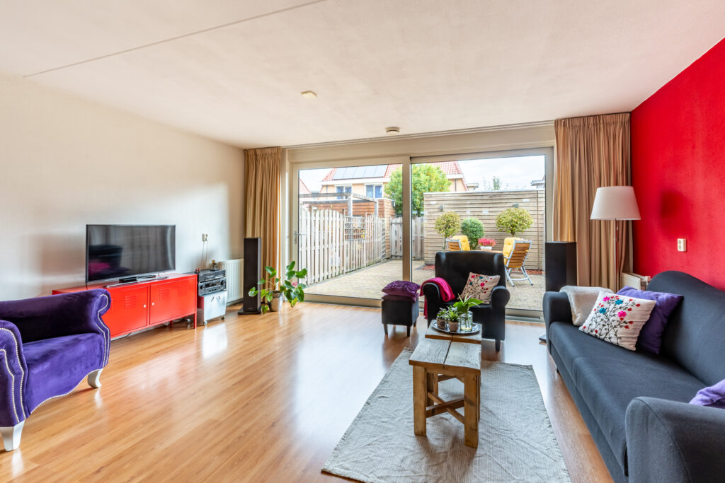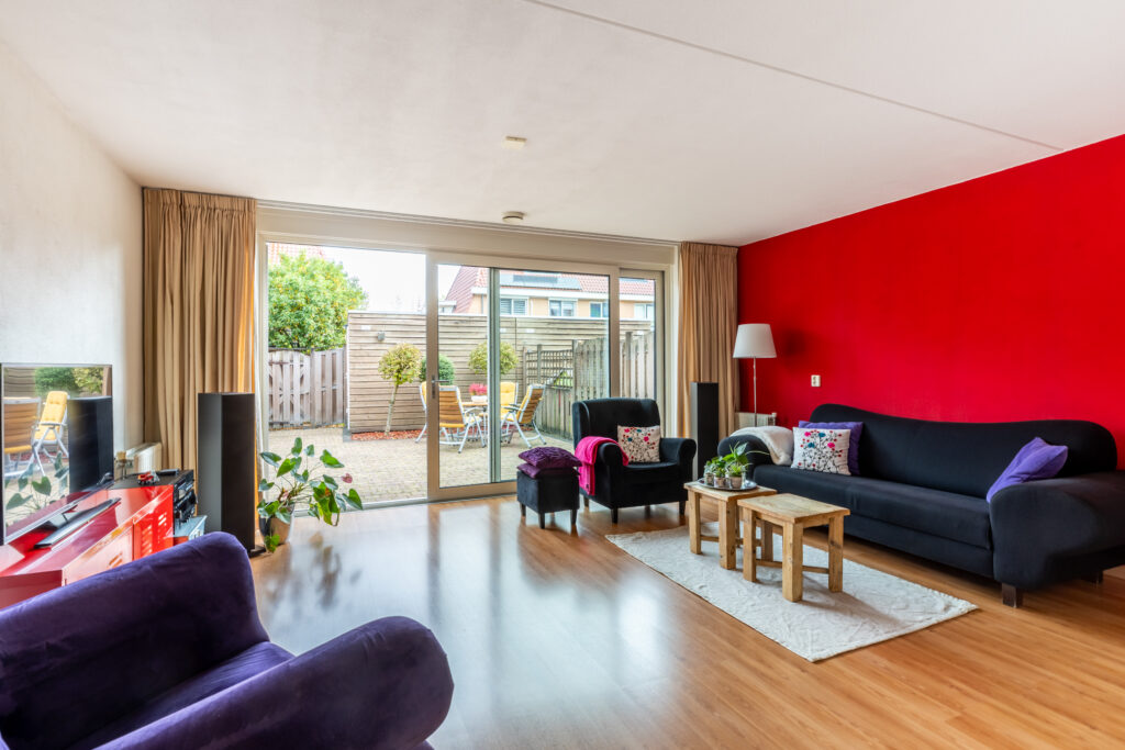 De woonkamer is tuingericht en heeft een optimale lichtinval door de kamerbrede raampartij met schuifpui aan de achterzijde.