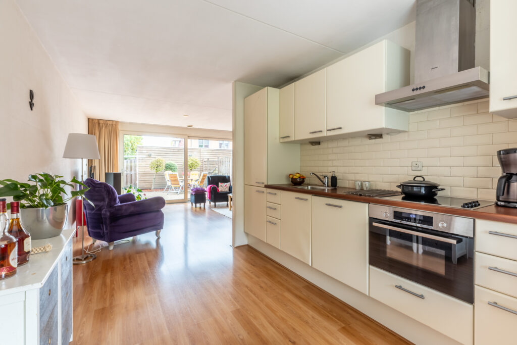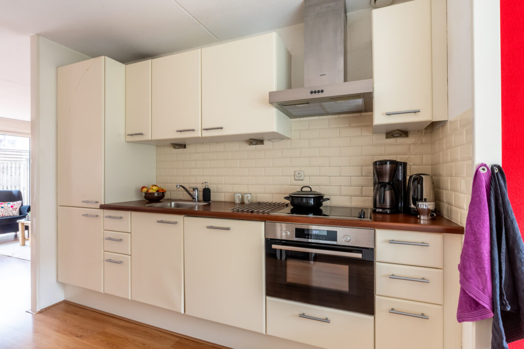 De open keuken bestaat uit een recht keukenblok met diverse inbouwapparatuur zoals een inductiekookplaat, afzuigkap, enkele spoelbak, vaatwasser, koelkast, vriezer en combi-oven.