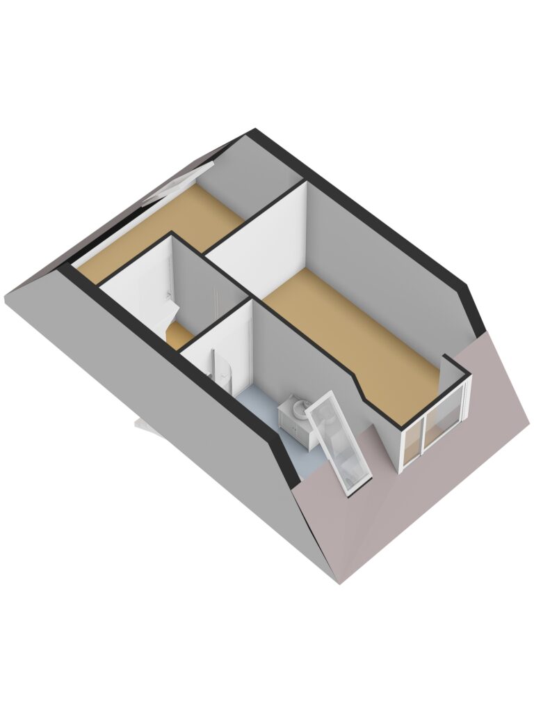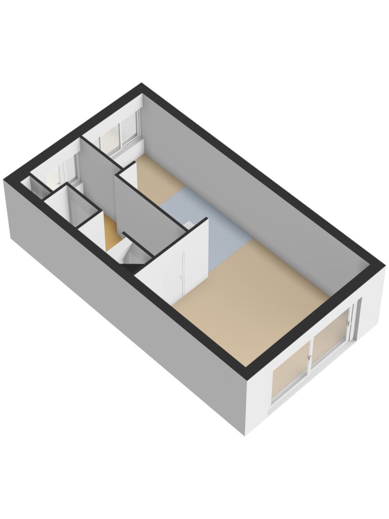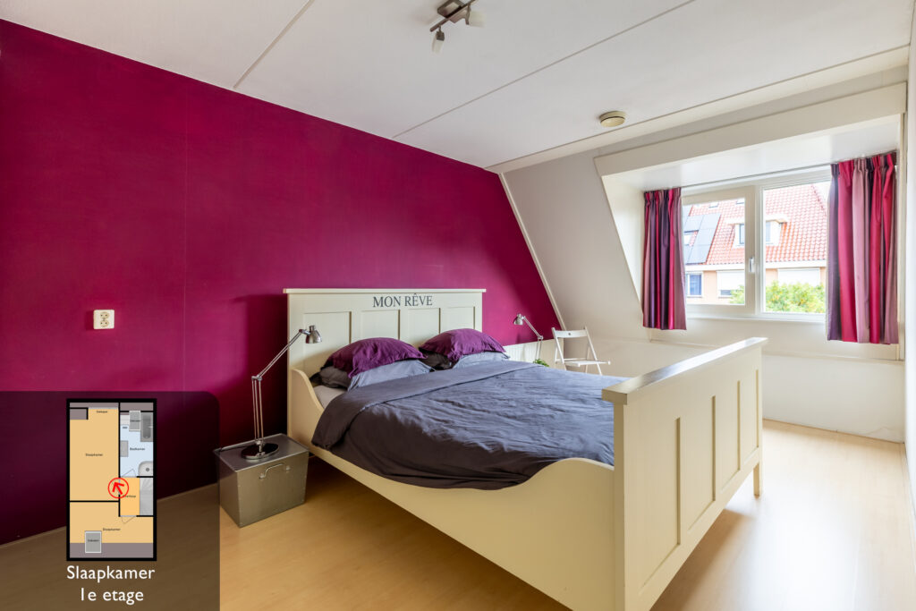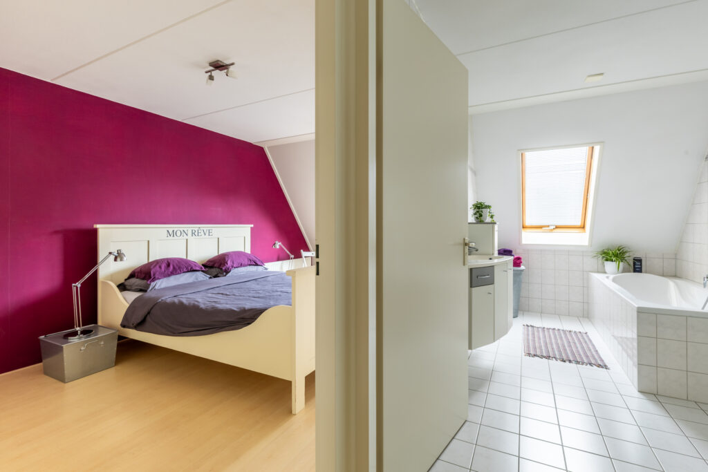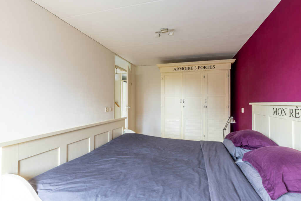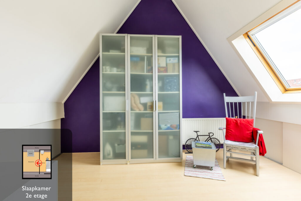 De slaapkamer is gelegen over de gehele lengte van de woning, heeft een hoge nok en voelt daardoor nog ruimer aan. Aan de achterzijde is er een groot dakraam en er is bergruimte achter het knieschot.