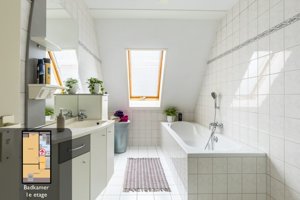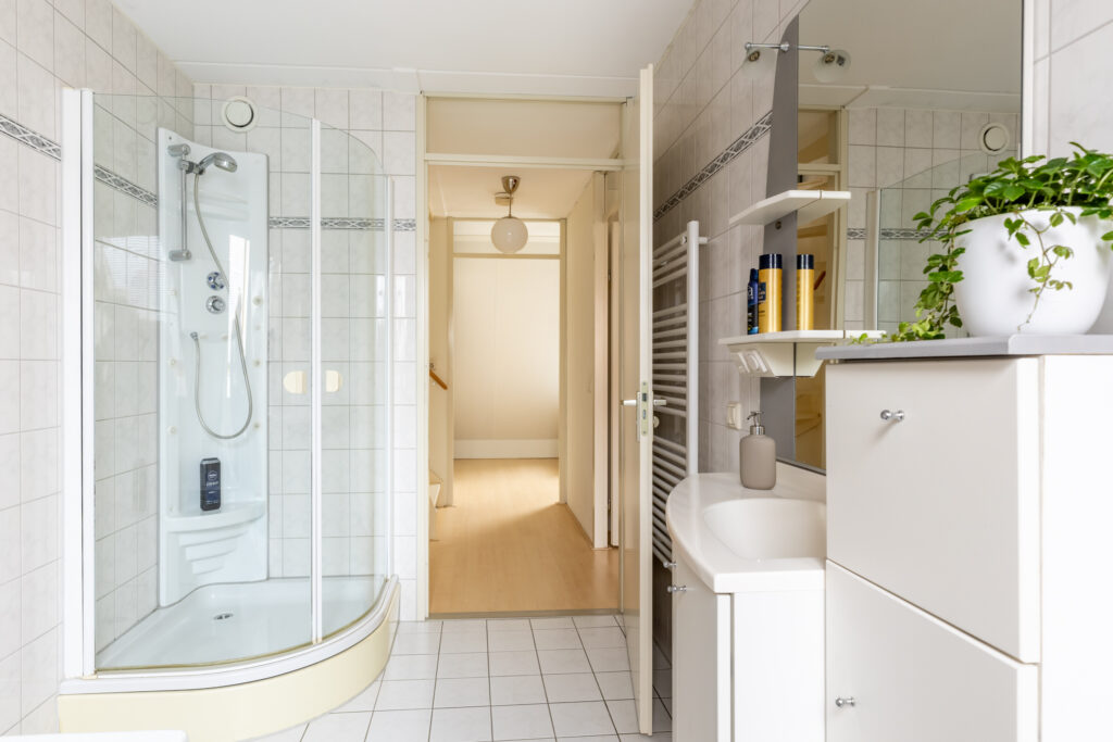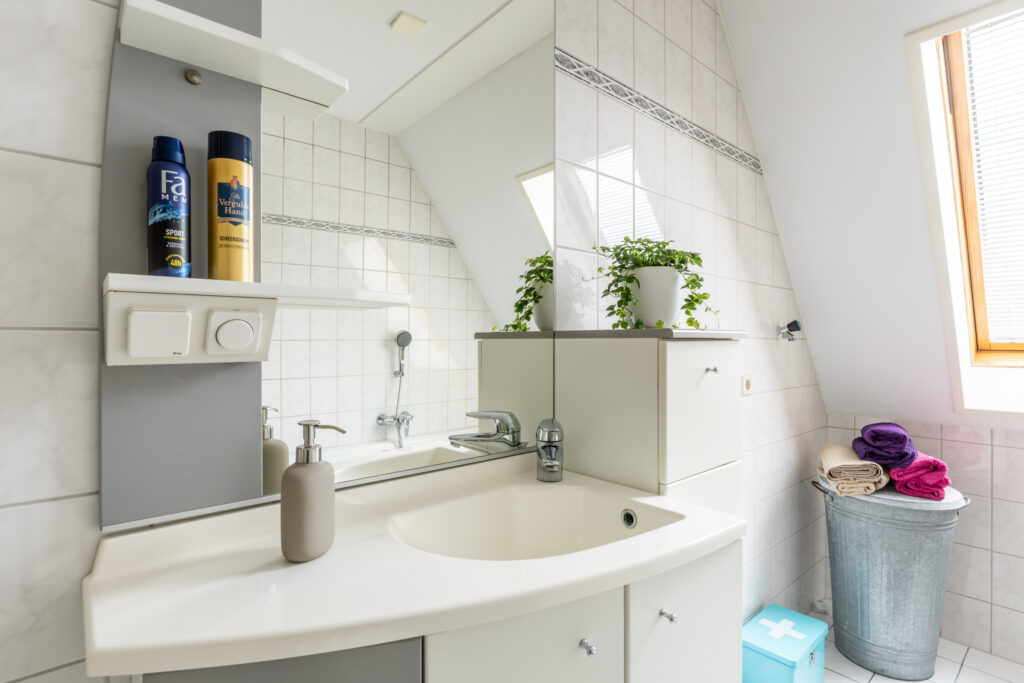 De badkamer is voorzien van een douche, ligbad, wastafel en er is een opstelplek voor de wasmachine.